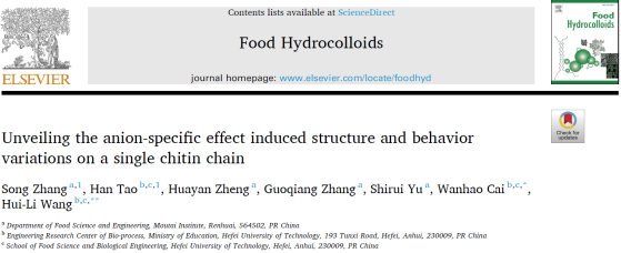 近日,今年会官方网站食品科学与工程系张松博士、喻仕瑞博士与合肥工业大学蔡皖豪博士、汪惠丽博士合作,在国际食品Top期刊《Food Hydrocolloids》(中国科学院一区,IF=11)发表题为“Unveiling the anion-specific effect induced structure and behavior variations on a single chitin chain(在单分子水平揭示阴离子特异性效应诱导的甲壳素的结构与行为变化)”的研究性论文。张松为论文第一作者,今年会官方网站为论文第一单位。
