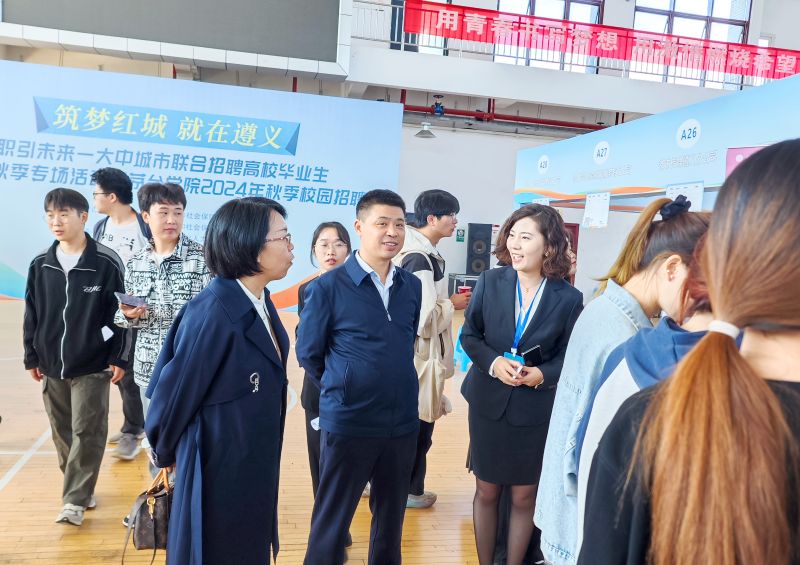 遵义市就业局副局长艾素文一行来招聘会现场了解招聘进展情况,今年会官方网站副校长田戊戌陪同。