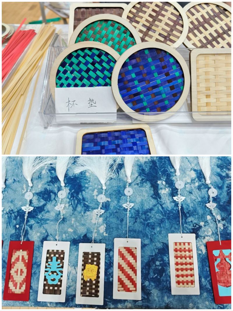 非遗文创区设有四个档口,展出并售卖同学们精心制作的竹编书签、蜡染发圈、耳饰、挂件等非遗文创产品,精巧的各种文创品深受现场师生青睐,纷纷驻足观赏,细心挑选自己喜爱的一款。