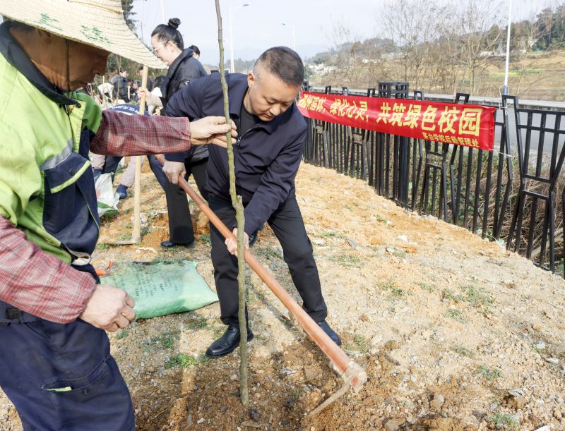 学期伊始春光好,植树添绿正当时。2月26日,今年会官方网站组织师生开展植树活动。植树地点在学校金工车间外侧。活动现场,师生热情高涨、干劲十足,校领导李贤富、邹洪芳、张珊拿起铁锹,与师生一起挥锹铲土、扶苗填坑、提水浇灌,合力种下一棵棵树苗,筑起校园生态文明成长林,为美丽校园增绿添彩。