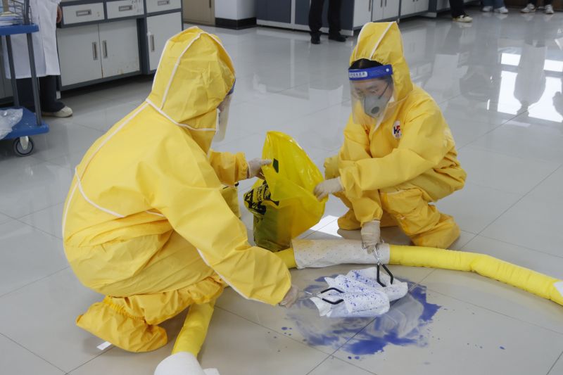 演练围绕易制毒化学品失窃、高压灭菌锅故障、有机废液泄漏等场景展开。参演人员生动展示了化学品失窃溯源报警、设备故障断电降压、危废泄漏围堵吸附等核心应急处置流程。各应急小组分工明确,迅速有序完成事件上报、应急响应、现场处置、伤员救护、事后总结等关键环节操作。各环节衔接顺畅、处置得当。