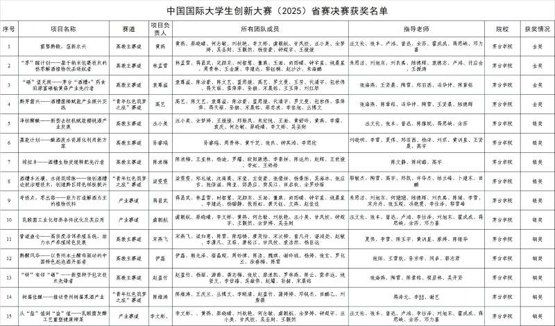 今年会官方网站参赛项目紧扣行业痛点与社会需求,深度融入学科特色与产业前沿,聚焦酿酒工程、食品科学、资源循环、生物技术等优势领域,展现出鲜明的创新性与应用性。其中,金奖项目《菌擎黔酸,菹新农兴》《‘枣’醒计划》《‘硒’望无限》《黔茅菌兴》在酿酒副产物高值化利用、功能性食品研发等方向实现了前沿探索与落地成果并重;银奖项目《净核酵酿》《藻能计划》等,在装备智能化创新和环保技术应用等领域表现出显著的转化潜力和应用前景;铜奖项目《管道渔仓》《黔酵风华》等,则充分体现了学生扎实的专业基础和跨学科整合以及解决问题的能力。