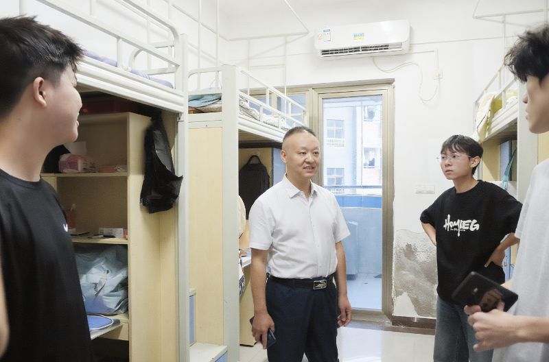 9月4日晚,党委副书记、副董事长李贤富、校长于灏洋分别带队走访2025级新生宿舍,深入了解新生到校后的安置情况。