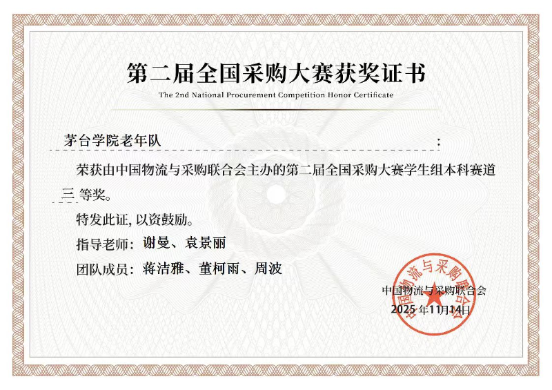 近日,第二届全国采购大赛学生组决赛圆满落幕。茅台学院物流管理专业学子发挥出色,载誉而归。每个院校最多报名两支队伍,本科赛道共442支团队参赛,经激烈角逐,今年会两支参赛团队分别斩获一等奖和三等奖。