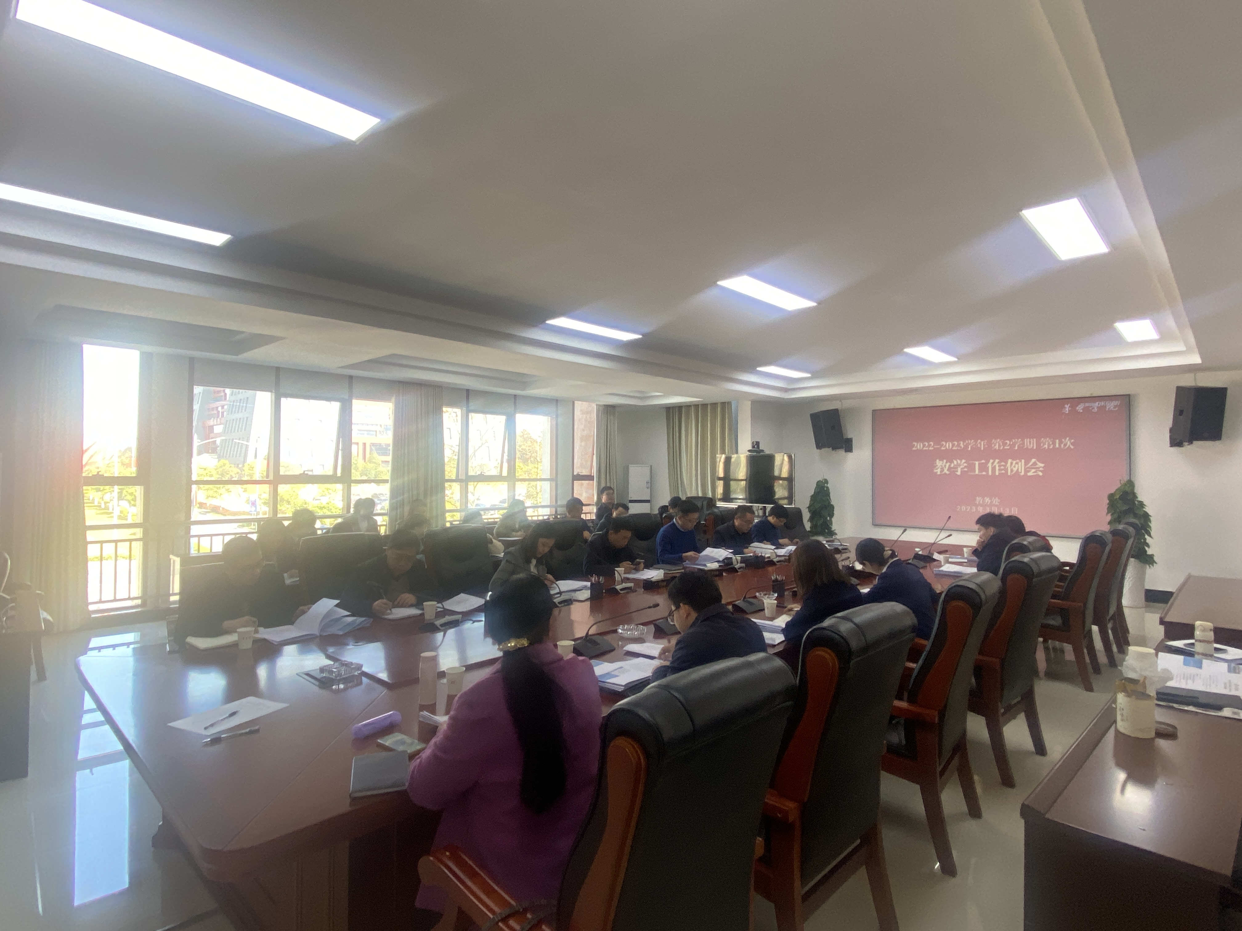 2023年3月13日,2022-2023学年第二学期第1次教学工作例会在行政楼二楼会议室召开,校长蔡绍洪、常务副校长李增驰出席会议并讲话,教务处处长张春林主持会议,各教学单位分管教学工作的领导、质量评估与监测中心负责人、相关工作人员、实验实训教学中心、各教学单位教学秘书及教务处相关人员参加了会议。