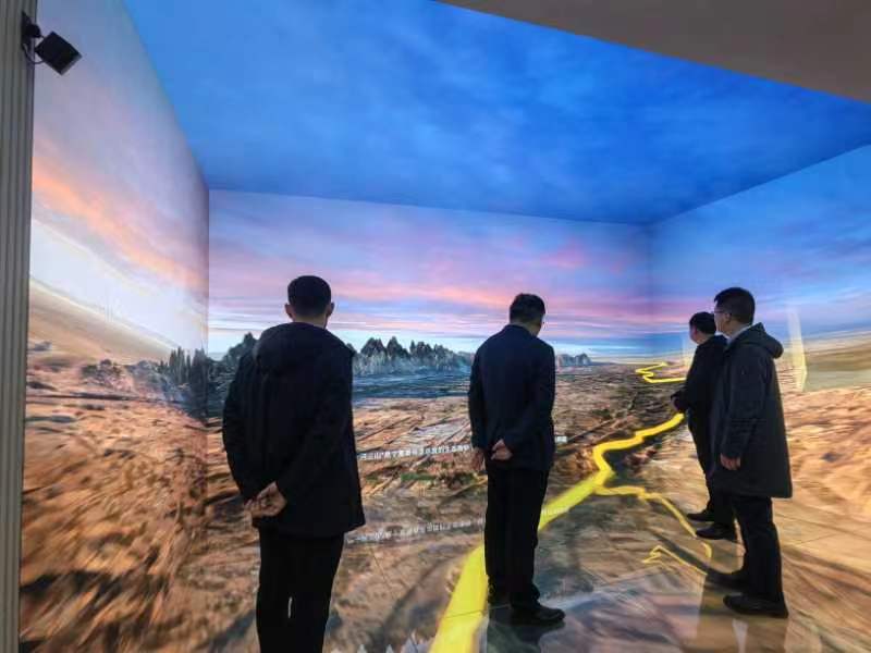 杜建录院长带领参观特色数据库中的3D数字展示厅,并通过“丝绸之路”案例展示了该厅身临其境的效果。