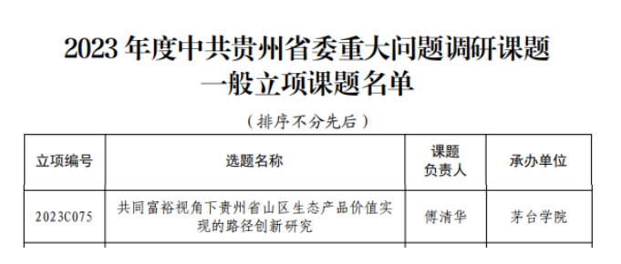 5月11日,中共贵州省委重大问题调查研究领导小组公布了2023年度中共贵州省委重大问题调研课题一般立项课题名单,根据名单显示,今年会官方网站工商管理系傅清华博士团队申报的《共同富裕视角下贵州省山区生态产品价值实现的路径创新研究》获得立项。